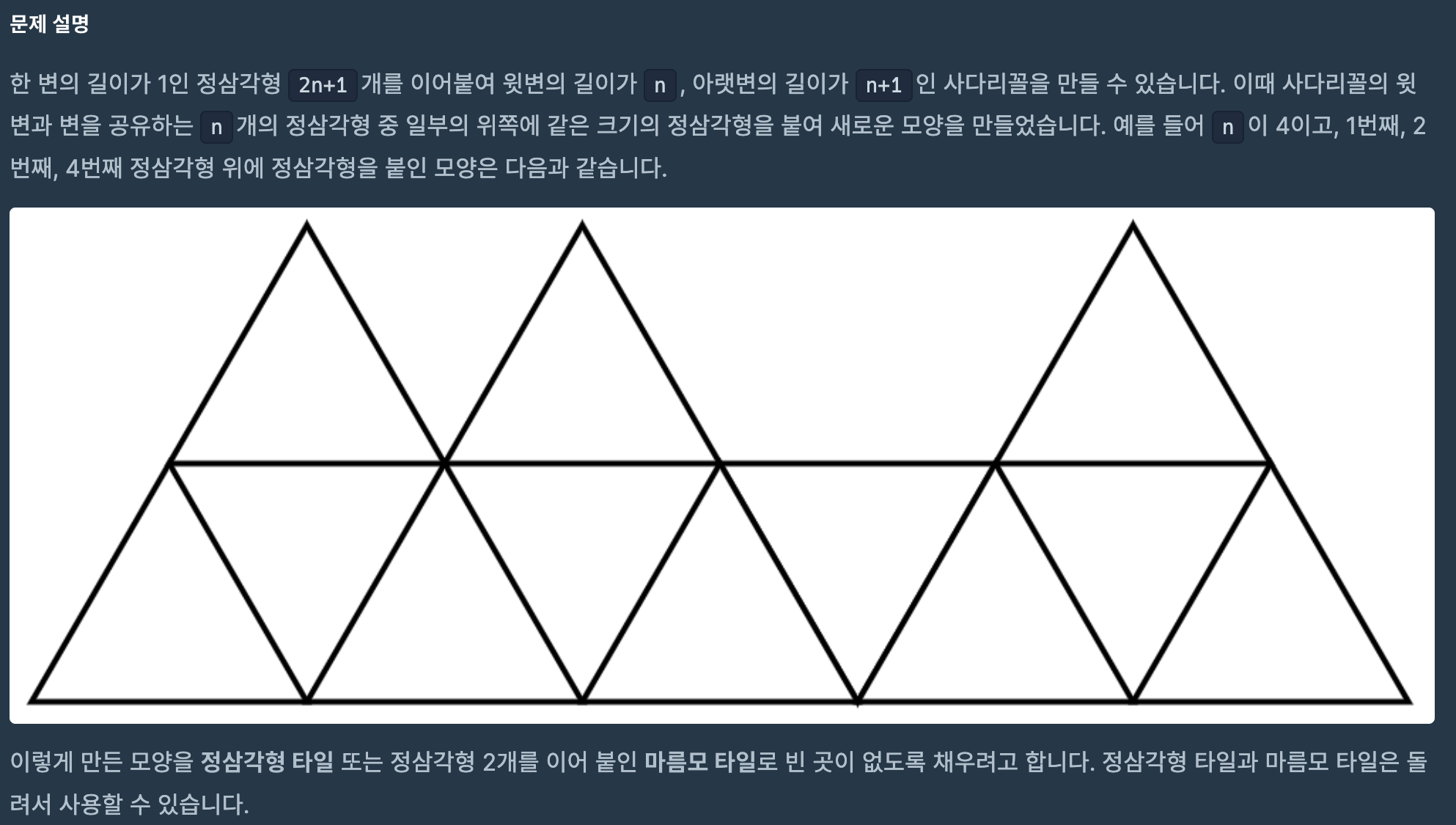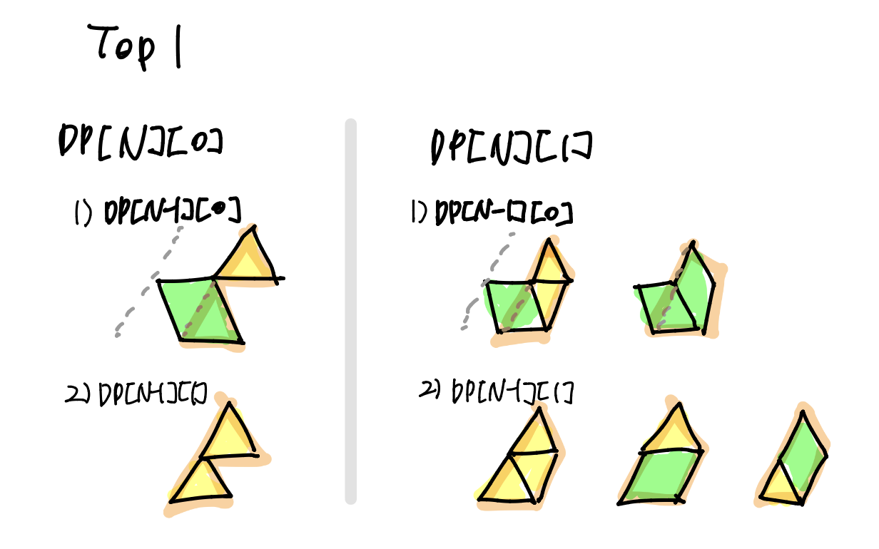 각각 DP[N-1][0]에서 마름모 퍼즐 하나를 채워넣는 경우, DP[N-1][1]에서는 세모 퍼즐을 사용하는 경우 하나씩이므로