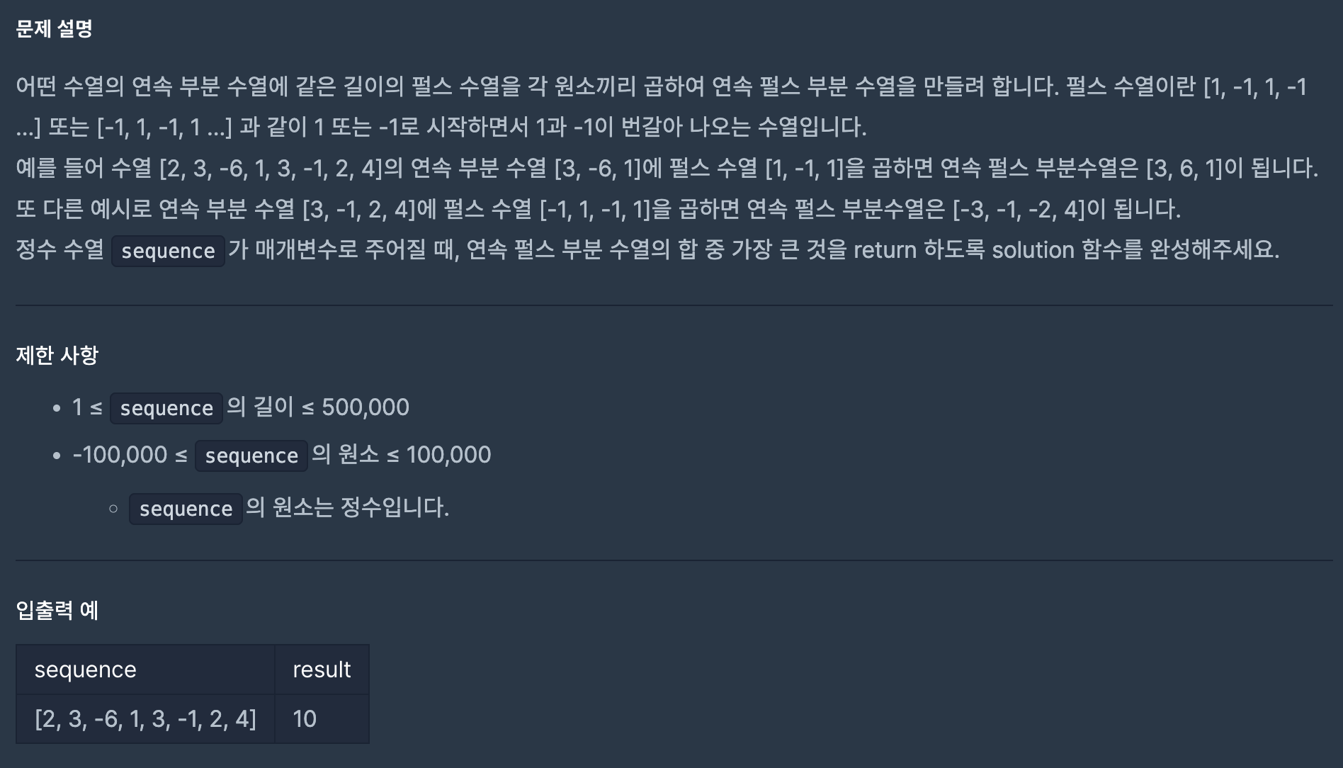 - 주어진 수(sequence[i])에 -를 곱하는 경우(=펄스 부분 수열에서 -1)를 DP[i][0]에 업데이트