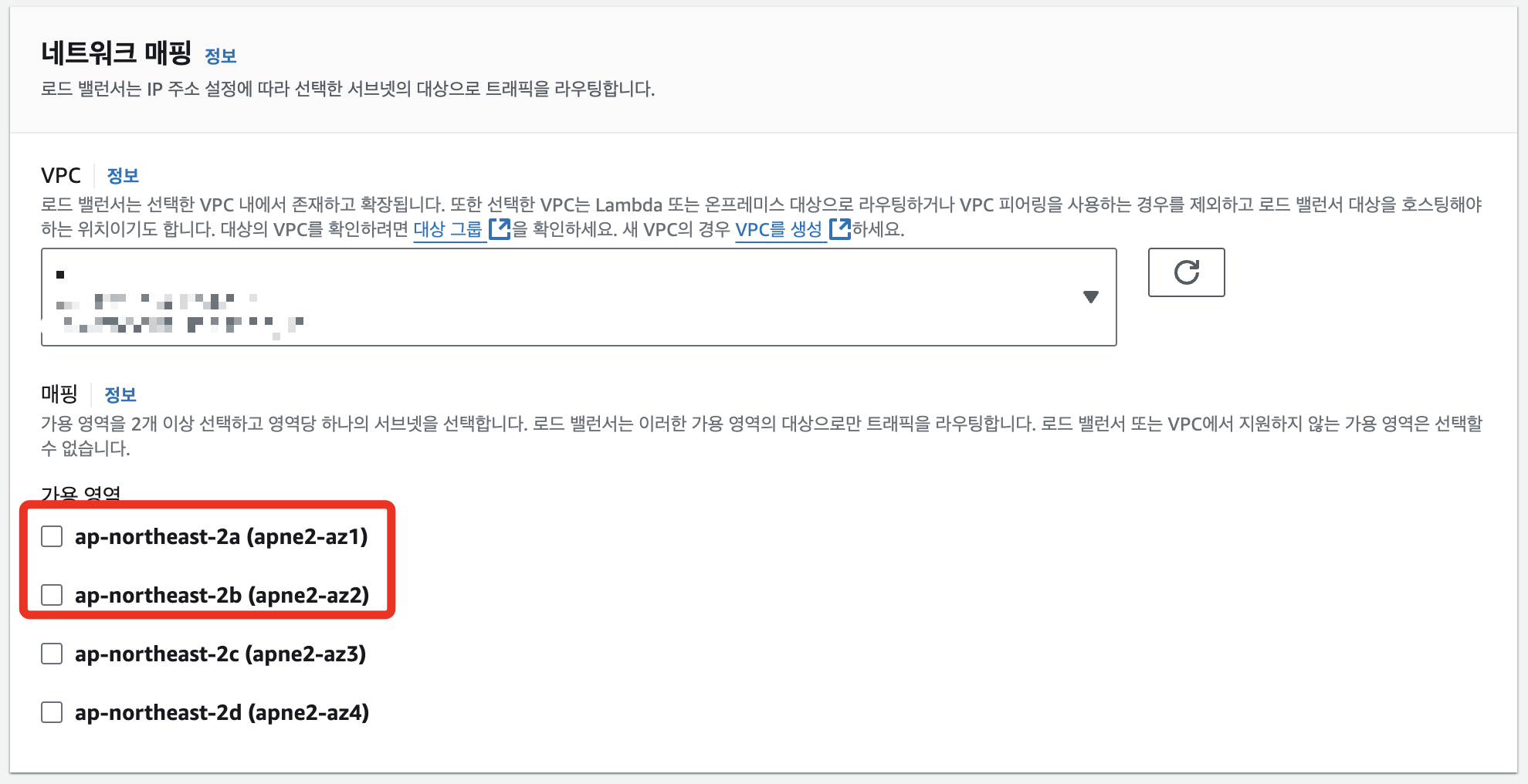 나는 일전에 생성 해 둔 EC2의 로드밸런싱을 고려하고 있기 때문에 EC2의 VPC와 ALB의 VPC를 일치시켜 주었다.