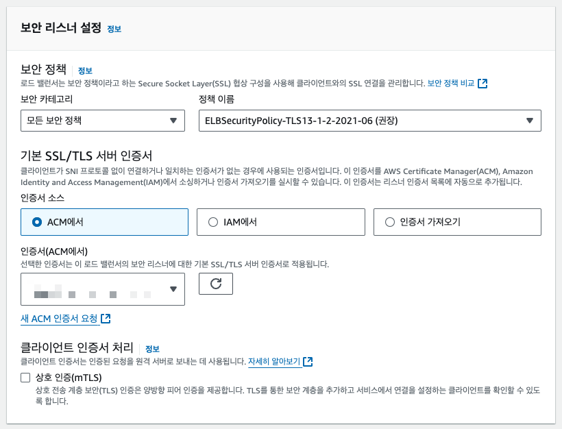 보안 리스너의 SSL/TLS 서버 인증서에서 ACM에서 발급받은 인증서를 등록하면 HTTPS 통신이 가능해진다.