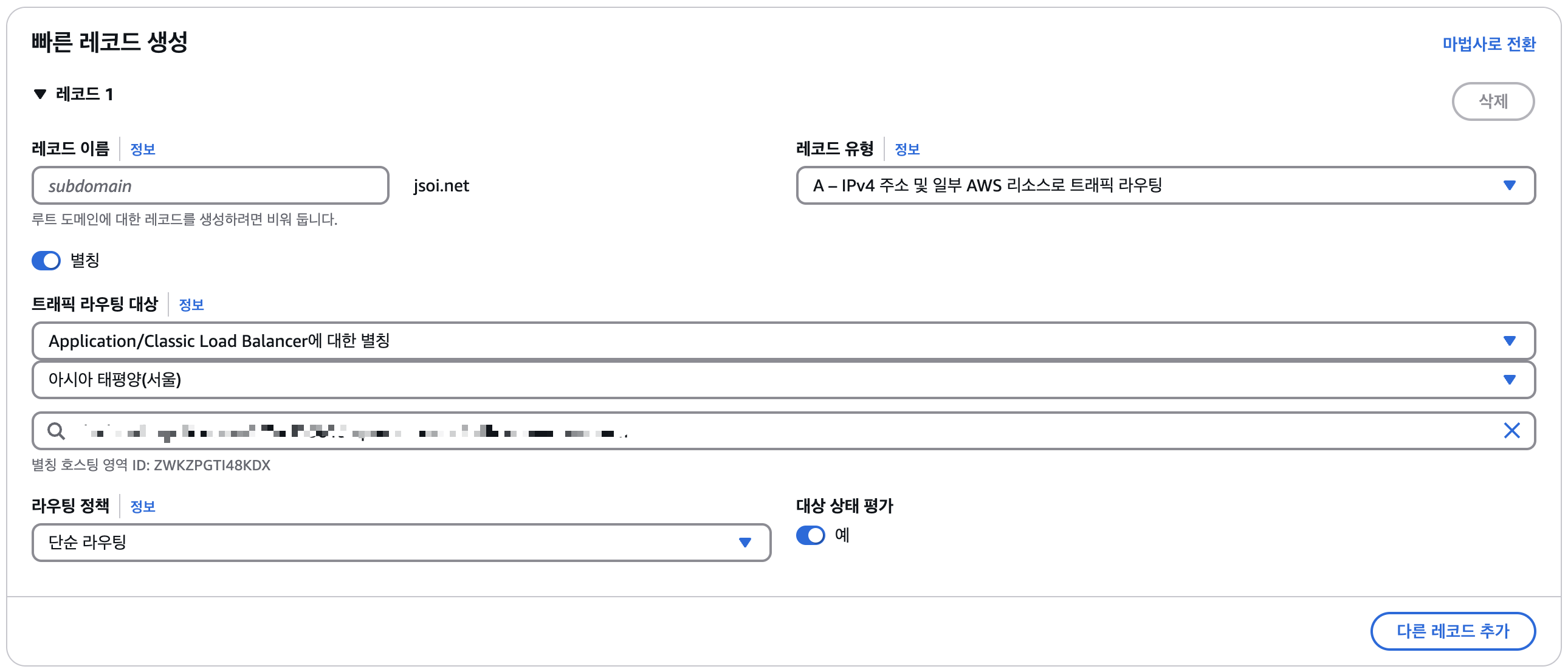 Route53-Hosting 영역-레코드 생성에서 다음과 같이 서브도메인을 생성해 주고,