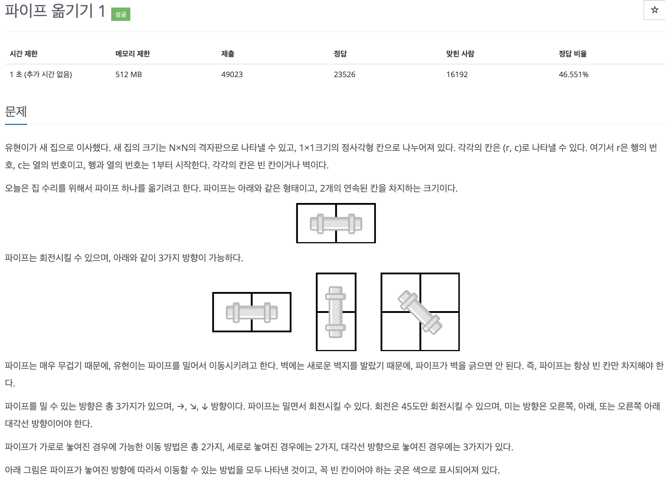 파이프의 배치를 보면 ↘️ 방향으로 진행되므로, 행과 열이 증가하는 방향으로 조사하며 DP 배열을 업데이트하면 될 것이다.