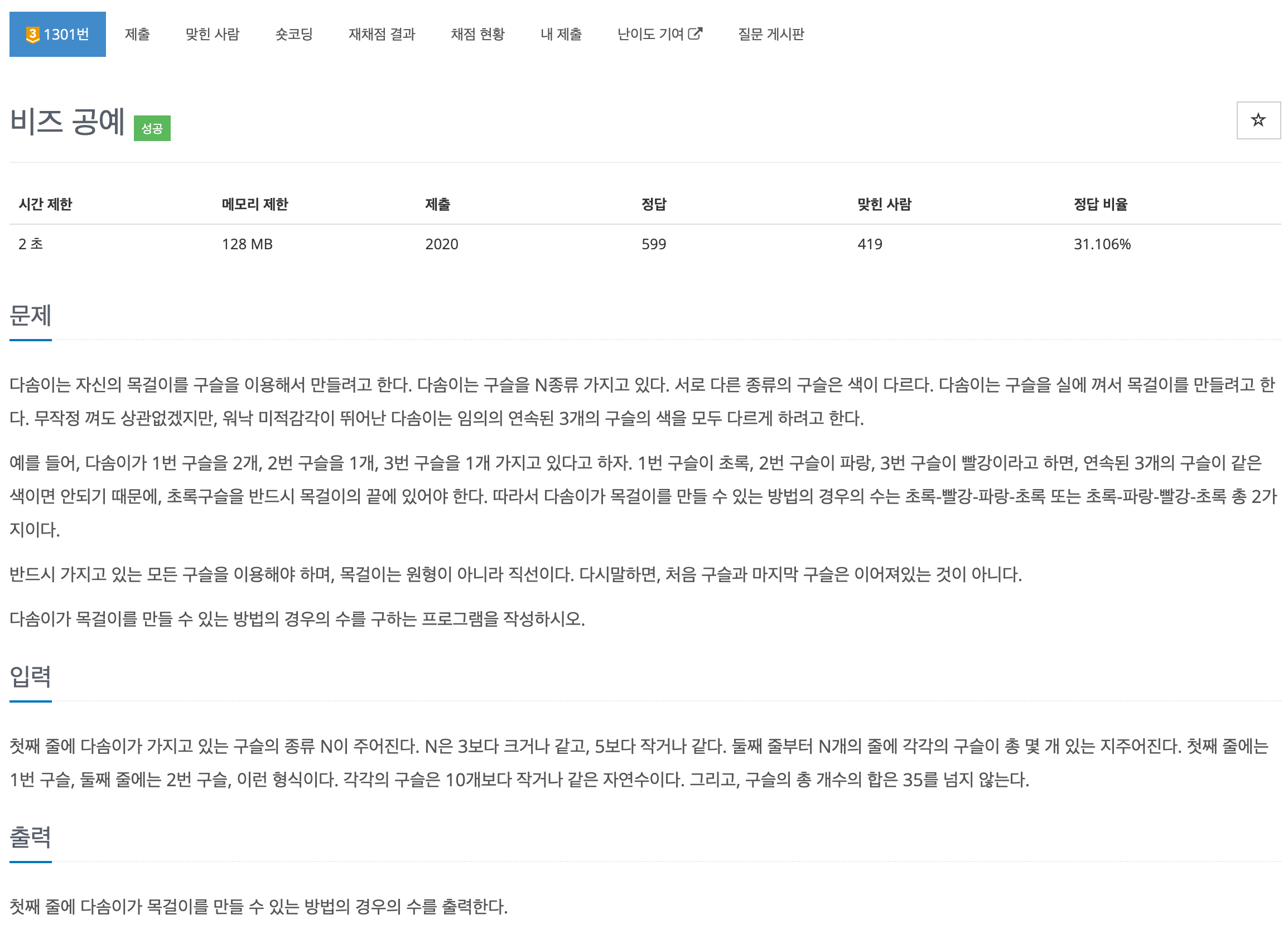 또 3개가 연속하면 안 되는 제약조건 때문에 [마지막에서 두 번째 구슬 종류][마지막 구슬 종류]도 DP 배열에 반영해야 한다.